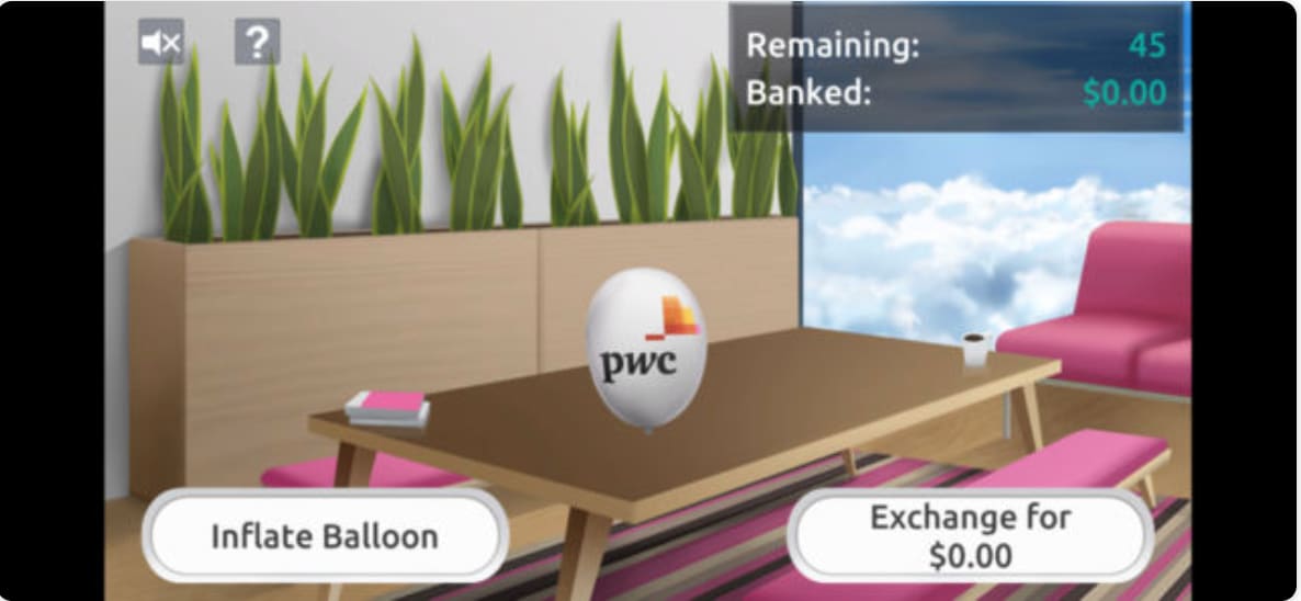 In this game, the candidate has to bank as much ‘money’ as possible by deciding to inflate a certain number of balloons. The more inflated the balloons, the more money they get, but if they inflate them too much, they may pop! Players can choose to bank a balloon at any time.