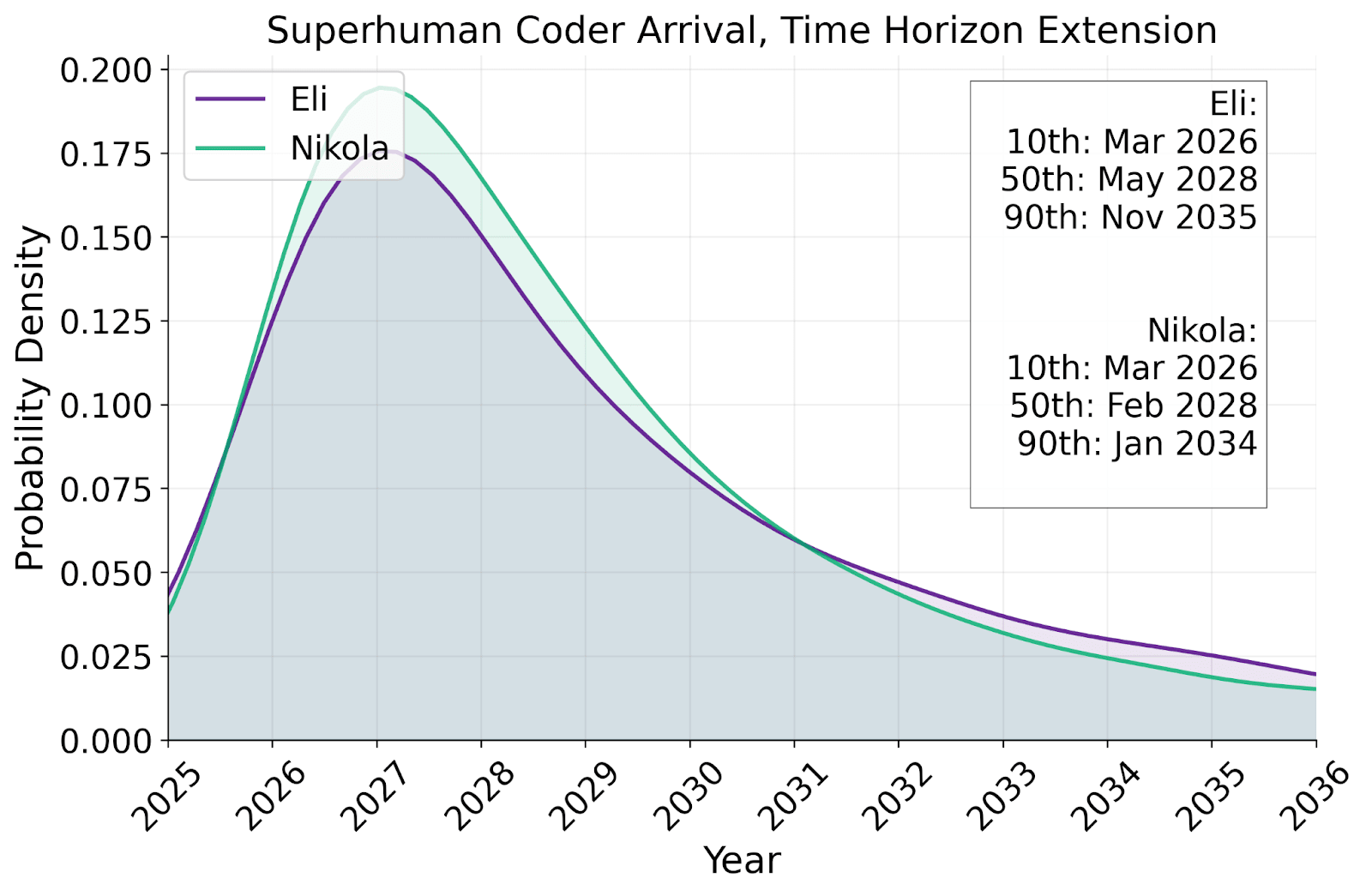 Another reason to adjust the time horizon downward: we are comparing the SC to the best coder, rather than METR’s human baseliners (who were skilled but not world-class). A reason to adjust the time horizon upward: tasks in METR’s task suite are sometimes harder than real-world tasks in some ways, for example sometimes the scoring functions are unrealistically unforgiving.