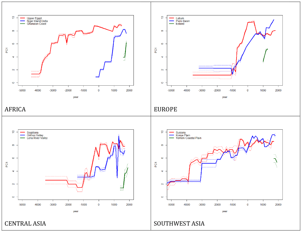 The results of Turchin et al. show a trend across regions. Civilizations seem to need around 1000-2000 years to spin up to a high level of complexity. Once reached though, the complexity mostly stays on a stable level. This implies that we can use civilizations as a comparison for today, once it has gone through its complexity spin up period. When this spin-up happens depends on the civilization. For instance, Upper Egypt reached this high complexity around 5000 years ago. For most of the societies considered the spin-up seems to have finished around the year 0. This means that roughly the last 2000 years seem like a reasonable proxy for today for much of the globe. The exception being some places that got complex very early, like Upper Egypt or never got highly complex (according to Turchin’s measure) like the societies in Oceania.