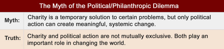 It's true that political action is a necessary step towards achieving meaningful, lasting change. However, the dichotomy between political action and philanthropy is a false one. Both play an important role in improving the world, and they can be mutually beneficial.