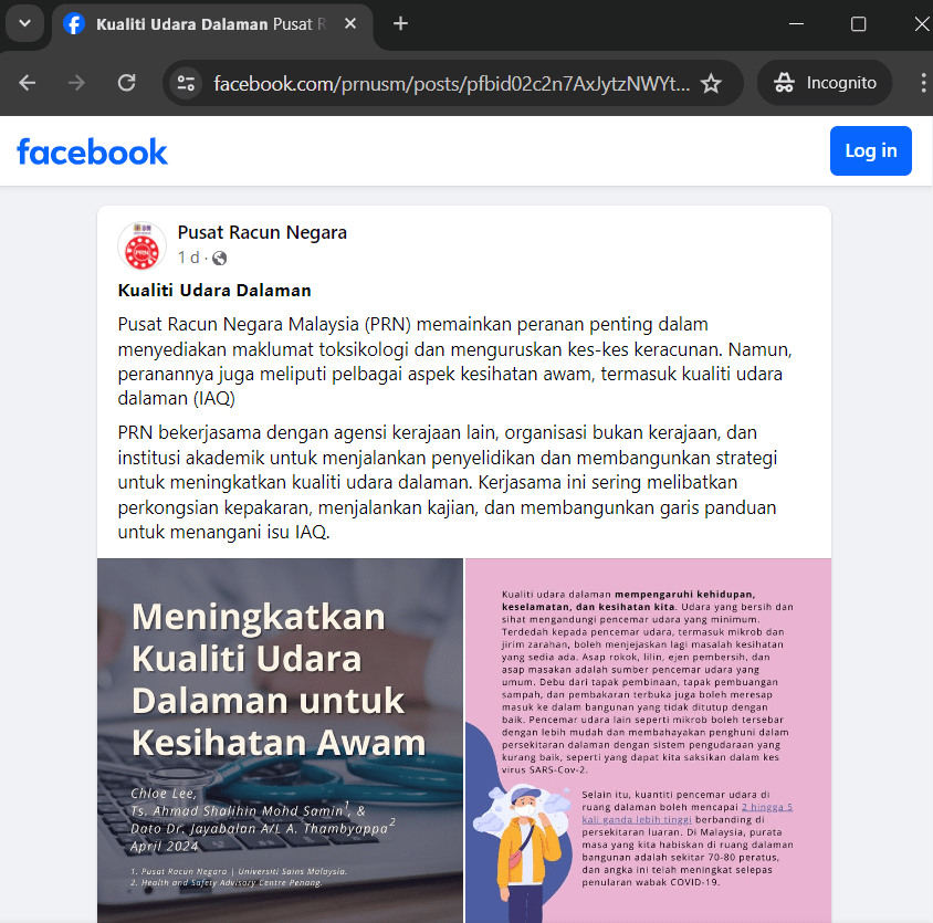 Translation: The National Poison Centre (Pusat Racun Negara, PRN) plays an important role in providing toxicological information and handling poison cases. However, its role also covers various aspects of public health, including indoor air quality (IAQ).