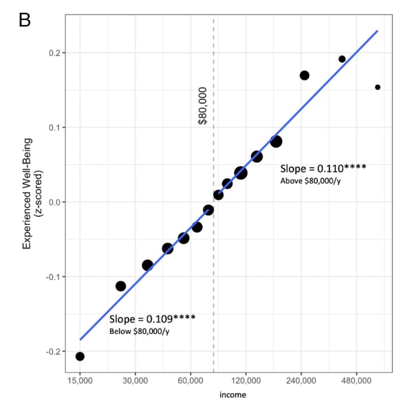 In their 2022 article, Matthew Killingsworth and Daniel Kahneman looked to reconcile the results from two of their papers. Kahneman (2010) had reported that above a certain income level ($75,000 USD), extra income had no association with increases in individual happiness. Killingsworth (2021) suggested that it did.