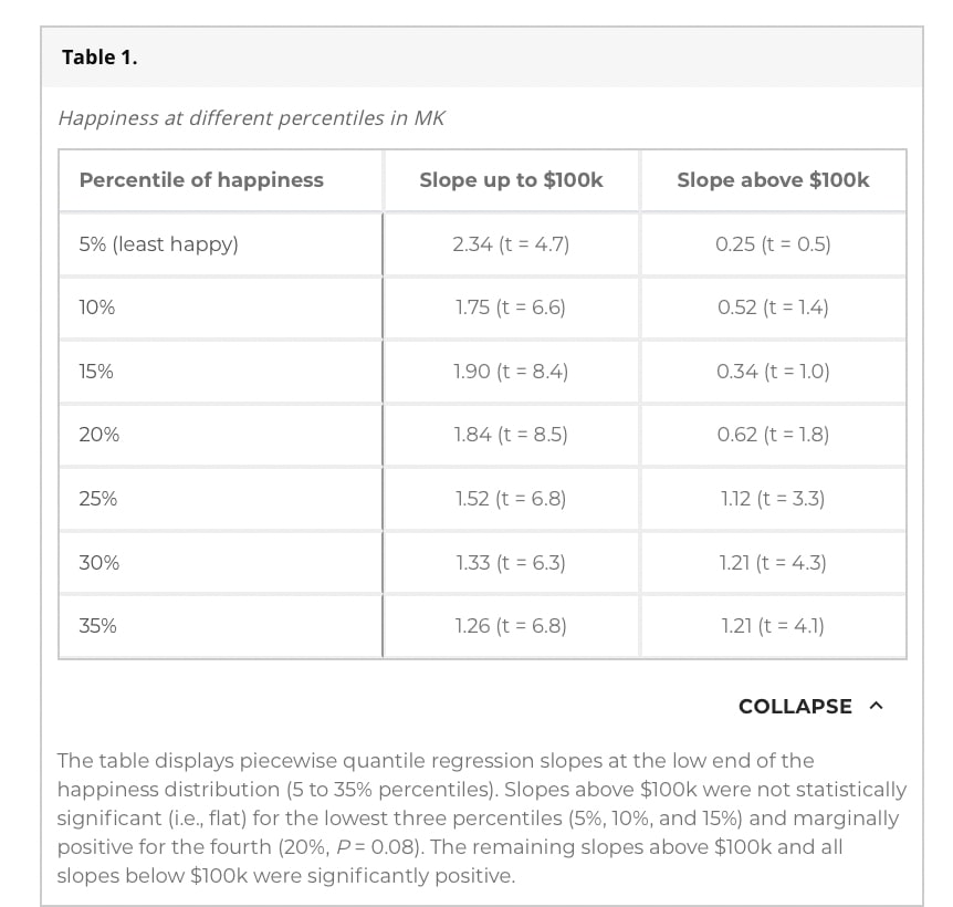 And for both 1) and 2), I am referring to the bottom percentiles. This is the unhappy minority which Kahneman and Killingsworth are referring to. So: the fact that slopes are indistinguishable after the income threshold for p=35, 50, 70 is consistent with the KK findings. The fact the slope increased for the 85th percentile is also consistent with the KK findings. Please look at Figure 1 if you want to double check.