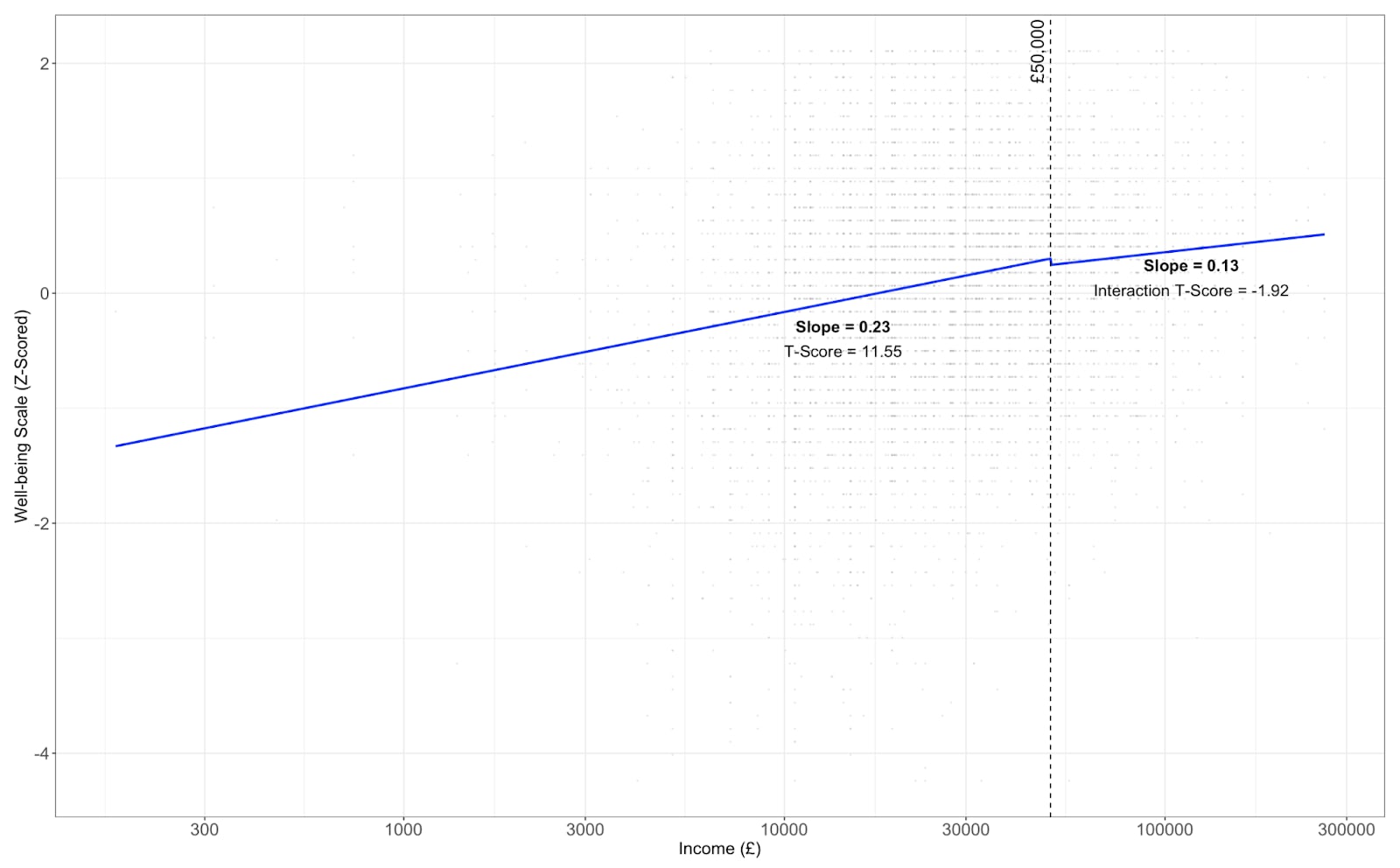 I found more evidence of relative leveling off after £50,000 – although the slopes are statistically indistinguishable at 5% (p = 0.055). However, the slope above £50,000 was significantly greater than 0 (i.e. no absolute levelling off).