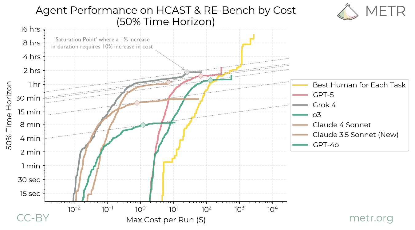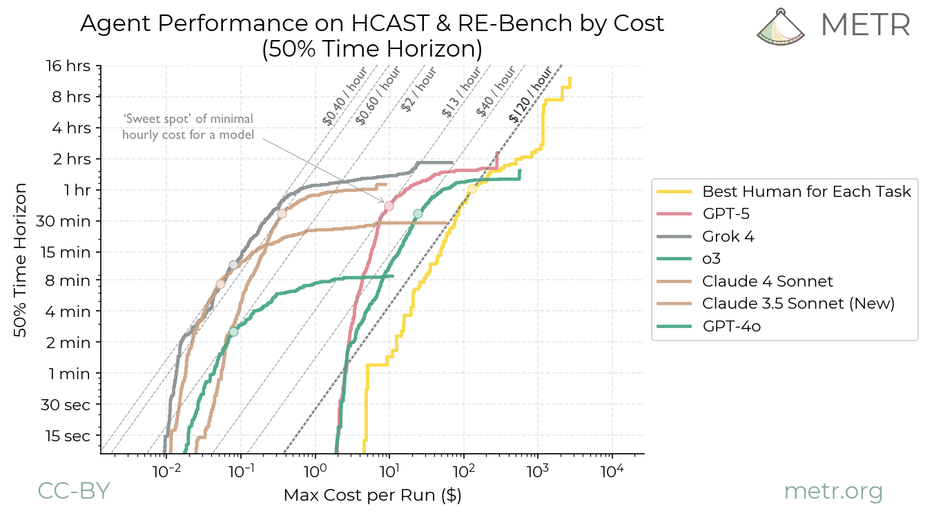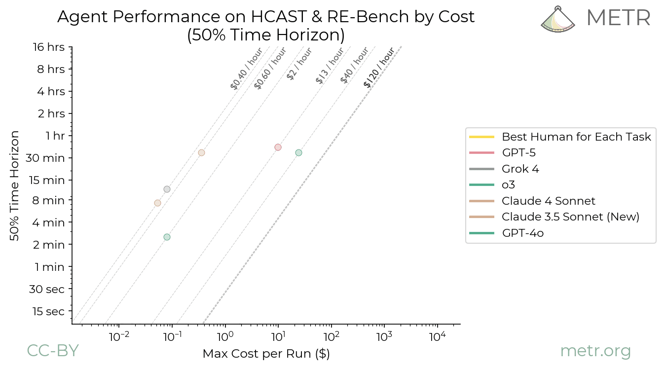 By ‘hourly’ cost I mean the financial cost of using an LLM to complete a task right at the model’s 50% time horizon divided by the length of that time horizon. So as with the METR time horizons themselves, the durations are measured not by how long it takes the model, but how long it typically takes humans to do that task. For example, Claude 4.1 Opus’s 50% time horizon is 2 hours: it can succeed in 50% of tasks that take human software engineers 2 hours. So we can look at how much it costs for it to perform such a task and divide by 2, to find its hourly rate for this work.