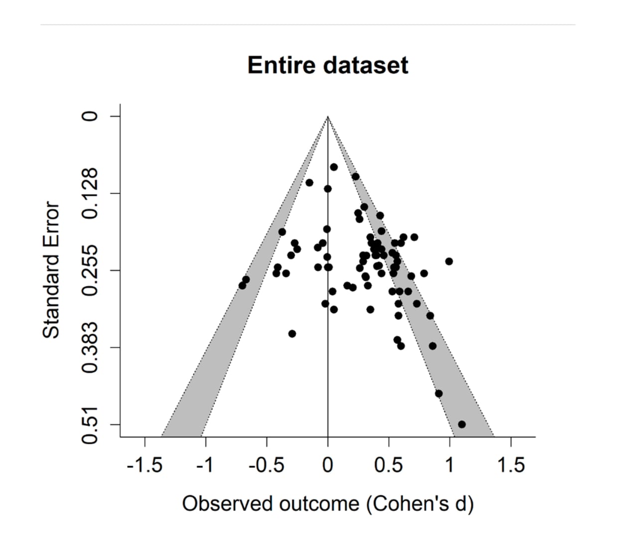 Further, Kuper and Bott carried out a meta-analysis to see if the results could be explained by publication bias. For instance, they found the literature showing the effects of moral licensing was made of “smaller studies yielding large effects and larger studies showing smaller effect sizes” which can be caused by low-powered studies with unimpressive results (small effect sizes) not getting published. Here’s their funnel plot.