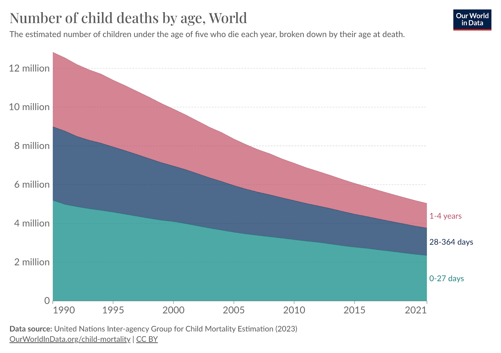 The first month of life is the most vulnerable period for a child's survival. In 2020, nearly half (47%) of all under-5 deaths occurred in the neonatal period. Older children tend to die from diseases such as diarrhea, pneumonia, measles, and meningitis. These are vaccine-preventable, so it has been relatively easy to make progress. However, the causes of death in the youngest children are very different. Pre- and post-birth complications – which are the primary cause of death in the early days of life – cannot be directly prevented by vaccinations.