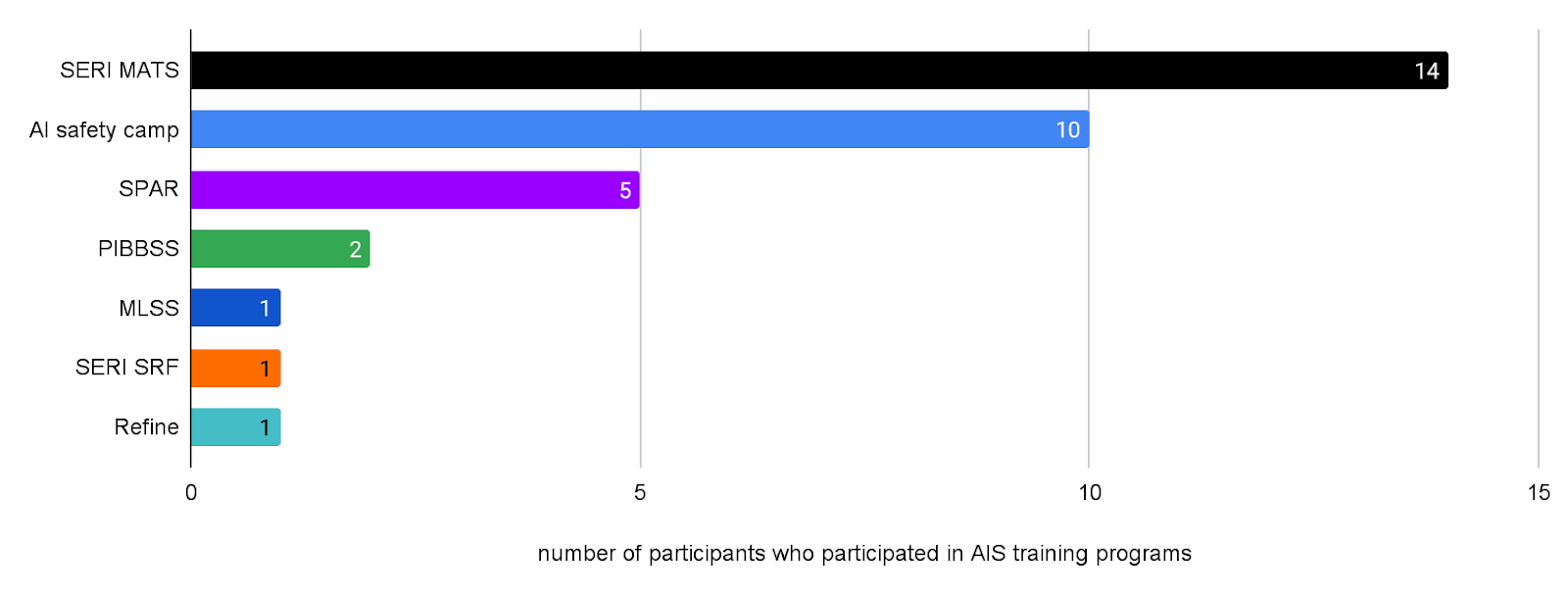Many participants had previously participated, or currently participate in AI safety research programs (SERI MATS, AI safety Camp, SPAR, PIBBSS, MLSS, SERI SRF, Refine)