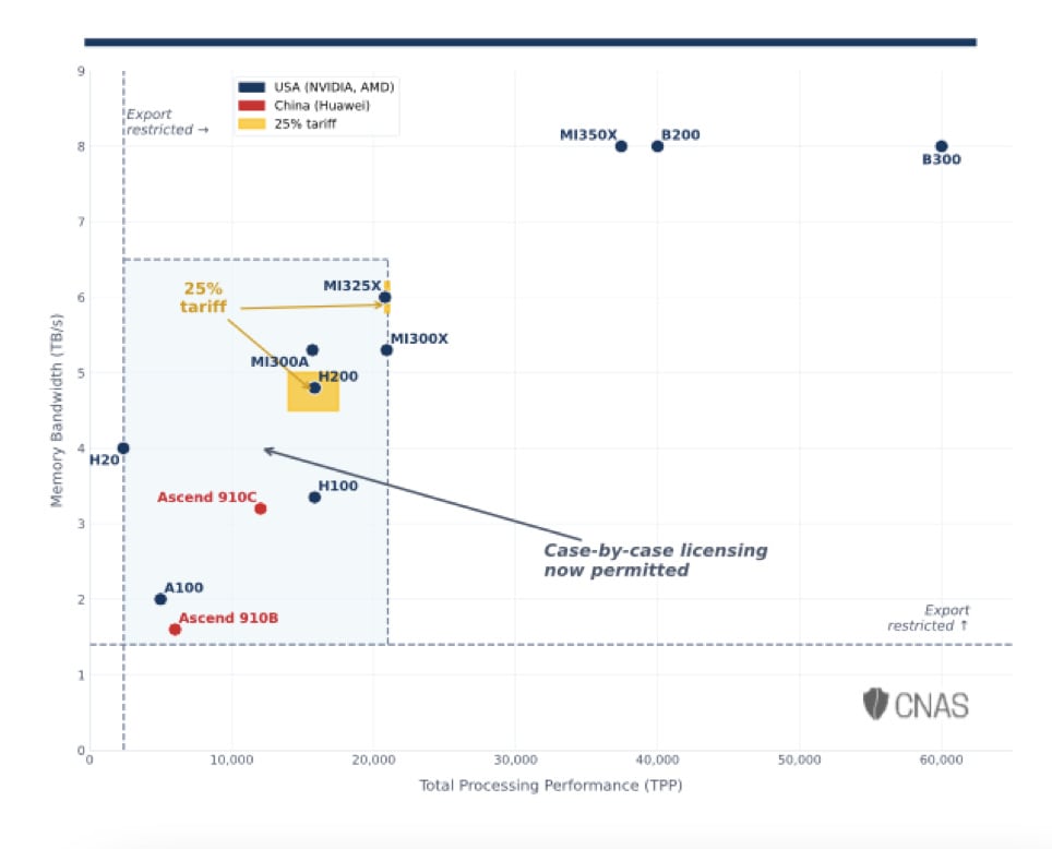 - The rule applies to chips with total processing power (TTP) less than 21,000 and Dynamic Random Access Memory (DRAM) bandwidth less than 6.5 TB/s. Those thresholds include not only H200, but also other lower performance chips (see Figure 2). However, according to CNAS, NVIDIA’s H200 and AMD’s MI325X have higher chance of obtaining US government’s approval, as the Trump administration intends to charge 25% export tariffs on those two models and therefore might be more willing to grant a license.