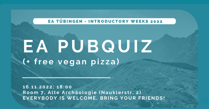Join us for this semester's pubquiz! Fun questions about EA and other things, presented by last semester's winning team. It'll be a blast! No prior knowledge of EA is required. We'll provide free vegan pizza, as well as snacks and drinks. Everybody is welcome - bring your friends! :)