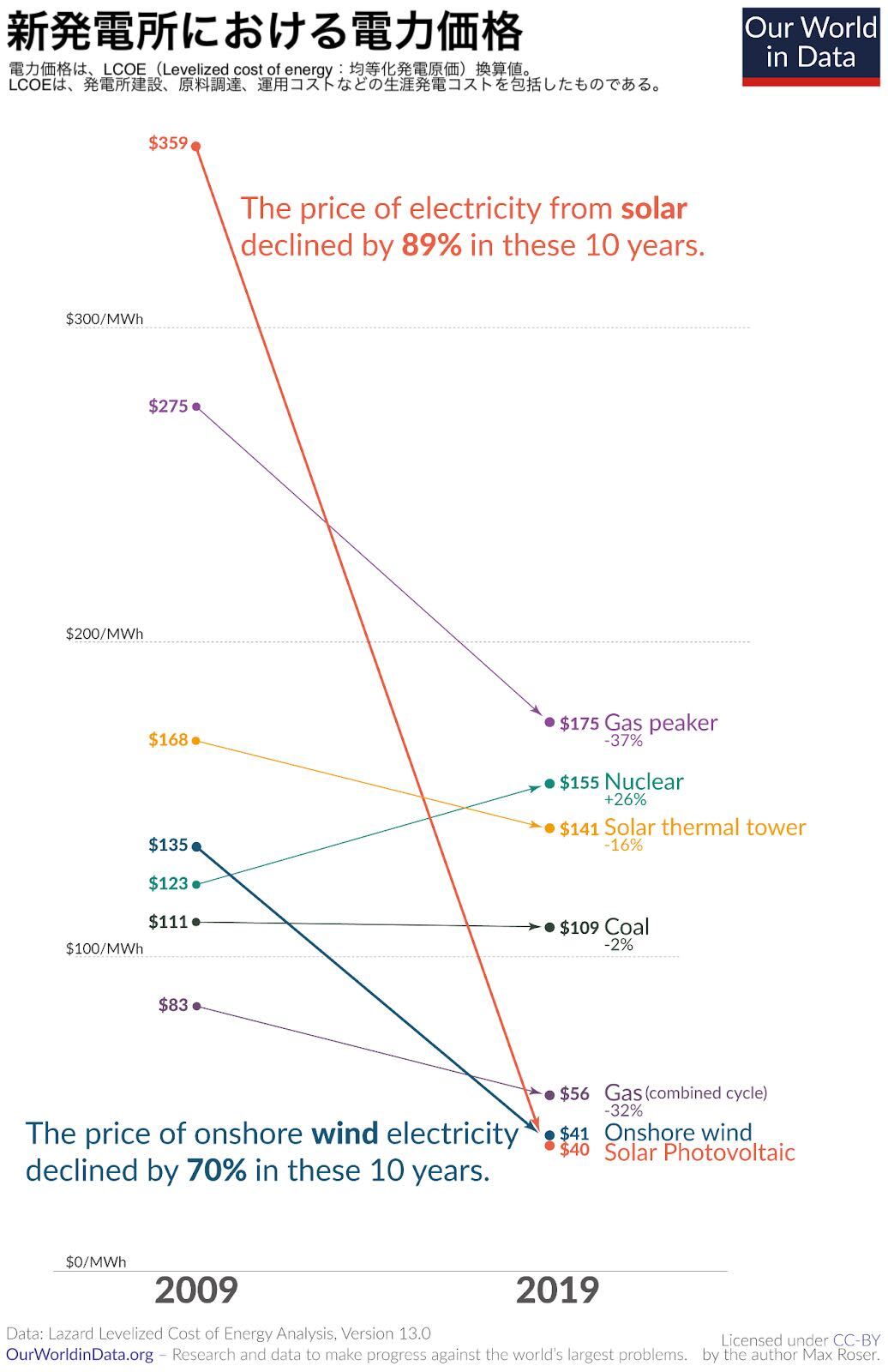 太陽光や風力発電による再生可能エネルギーは化石燃料より安くなった(出所:Our World In Data)