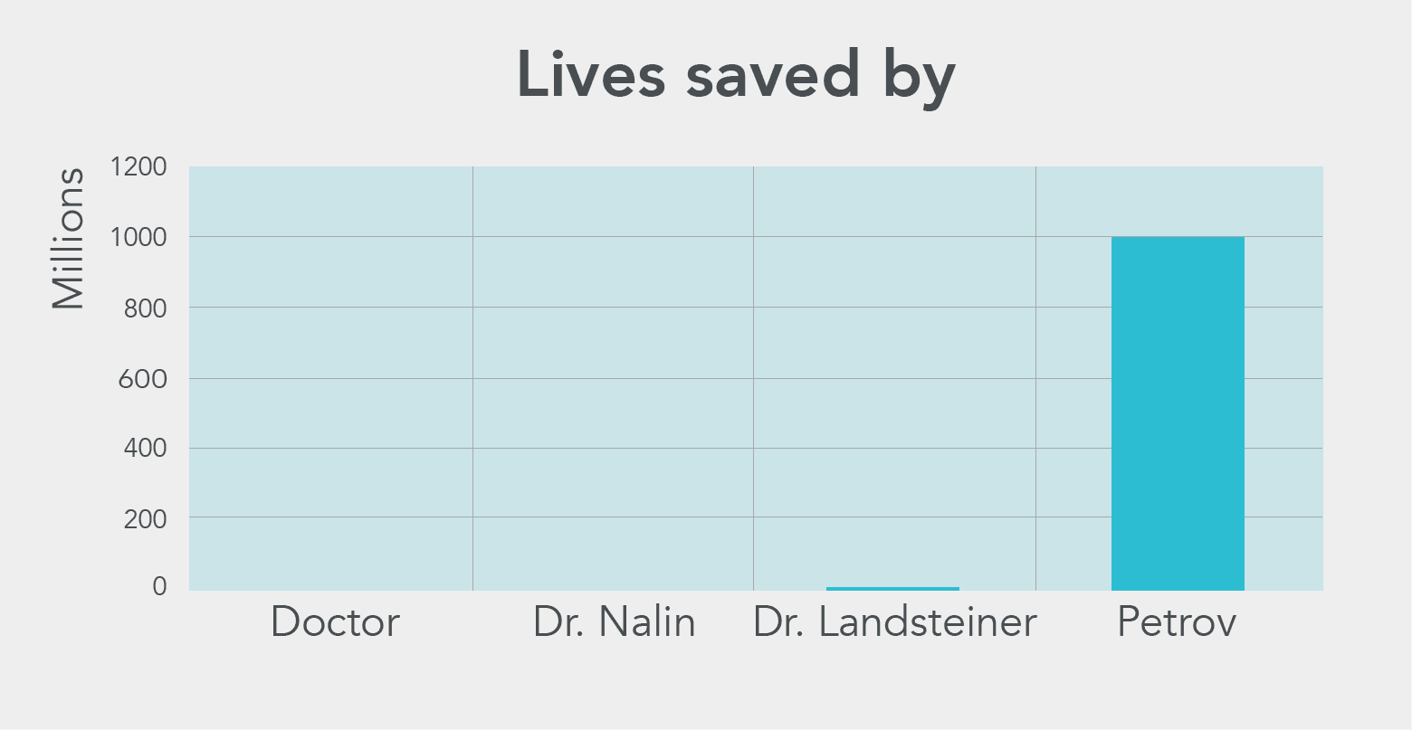 冷戦時にソ連軍の中佐であったStanislav Petrovの語について考察してみよう。1983年に、Petrovはソ連のミサイル基地で勤務中に、早期警戒システムがアメリカからのミサイル攻撃を探知した。公式のプロトコルでは、ソ連軍は反撃のミサイルを命ずることになっていた。