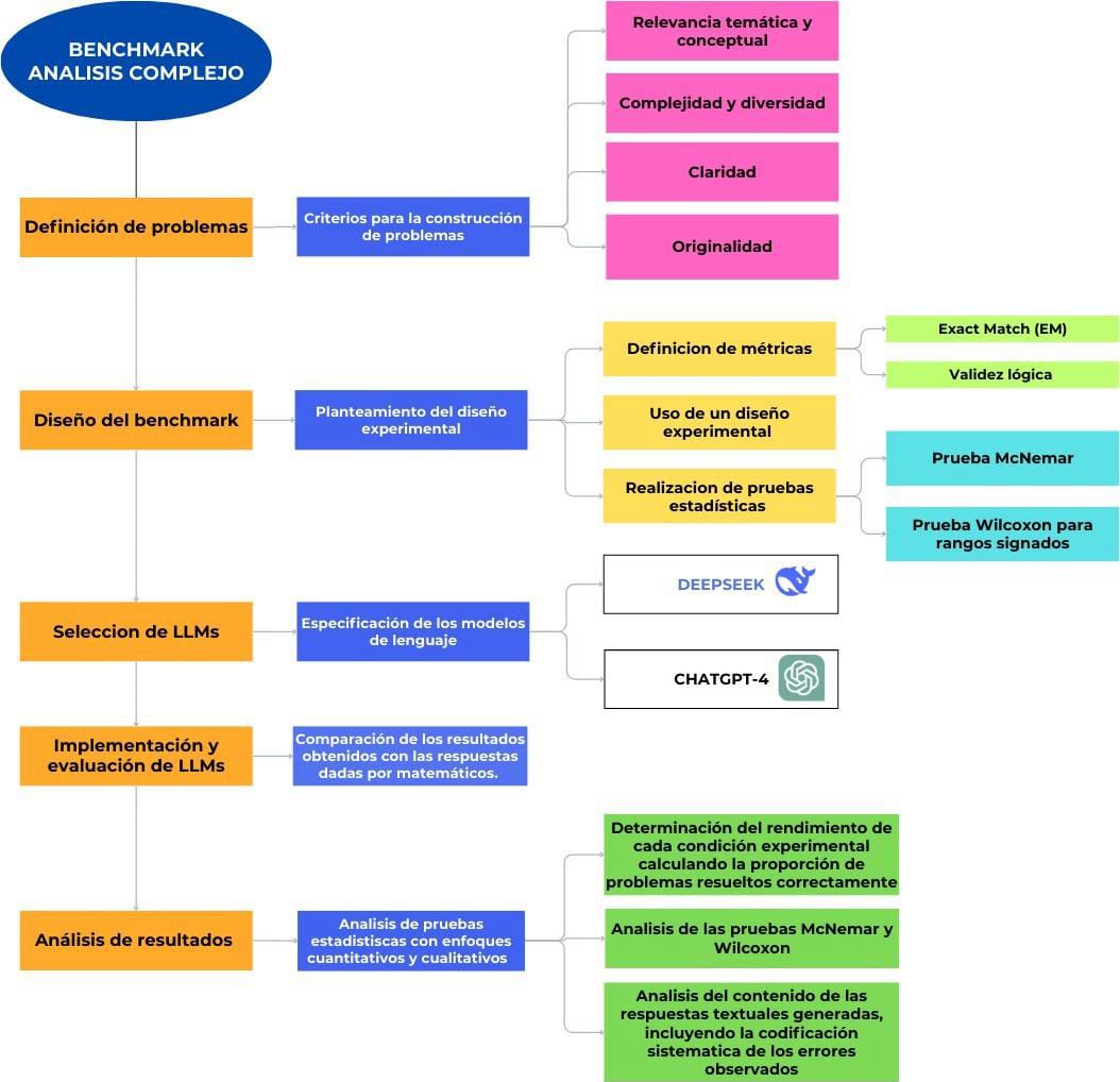 Figure 1. flow diagram of the complex analysis benchmark methodology. The figure illustrates the methodological flujo de trabajo employed in the study to evaluate the capabilities of LLMs in the complex analysis domain under the Zero- Shot prompting technique.