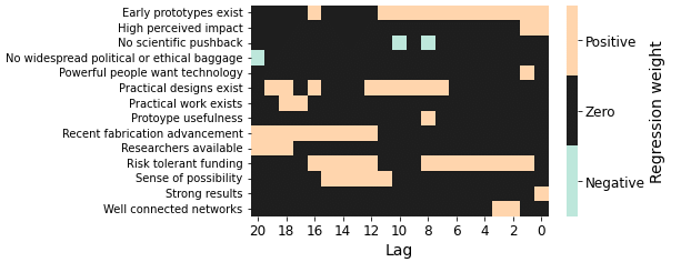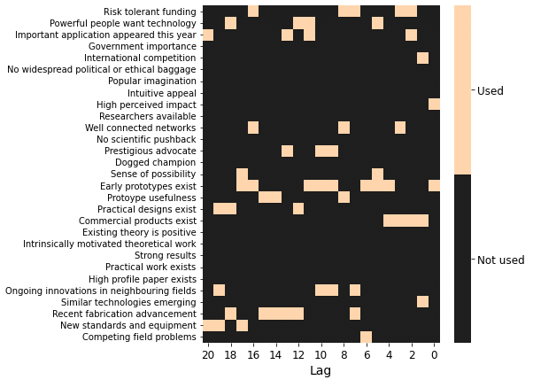 For example, at lag 0, the decision tree uses “high perceived impact” and “early prototypes exist”. These two factors were also selected by the logistic regression for lag 0 factor (alongside another factor, “strong results”).
