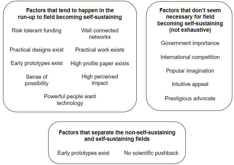 On the other hand, factors that didn’t seem necessary for field establishment in our dataset include: the existence of a prestigious advocate, international competition, the technology being easy to capture people’s imaginations with, the technology being generally known about, and perceptions of particular importance from governments (more here).