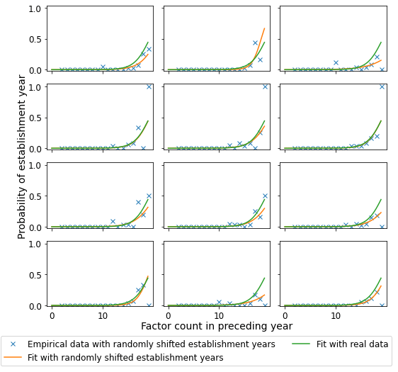 The plot shows that randomly shifting the establishment years generally changes the fitted curve a bit, and probably also makes the fit a bit worse on average; but the effect isn’t too dramatic. This shows that the logistic regression fit of establishment year against factor count in the preceding year shown in the main text is fairly robust to randomly shifting the establishment year for each field by a few years, and so the apparent predictive power of factor count in the preceding year doesn’t hinge on the exact establishment years we chose when collecting the data.