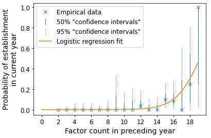 The preceding two plots show that the logistic regression fit of establishment year against factor count in the preceding year shown in the main text is fairly robust to dropping or resampling fields within the dataset.