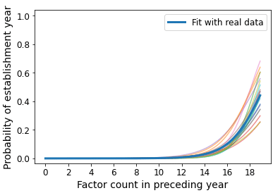 The plot below again shows fits from logistic regressions of establishment year against factor count in the preceding year, but this time the transparent multicoloured lines correspond to fits where bootstrap sampling was used to select the set of 10 fields (i.e. the set of 10 fields to use in the regression was randomly sampled, with replacement, from the true set of 10 fields; note that, as above, the plot contains 20 of these lines).