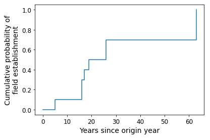 One issue is that we only have 8 observations of establishment years, whereas we have 100s of observations of years in which a field is self-sustaining. ↩︎