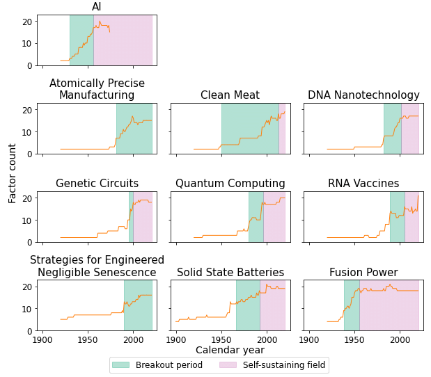 As for the identity of the factors that most often occur within the breakout period: “early prototypes exist” first occurs within the breakout period for all 8 fields; “risk tolerant funding”, “well connected networks”, and “practical designs exist” first occur within the breakout period for 7 fields; and “powerful people want technology”, “high perceived impact”, “practical work exists”, and “high profile paper exists” first occur within the breakout period for 6 fields. Maybe unsurprisingly, these factors are similar to the ones identified by eye as tending to occur in the run-up to field establishment in the section called When the different factors tend to occur.