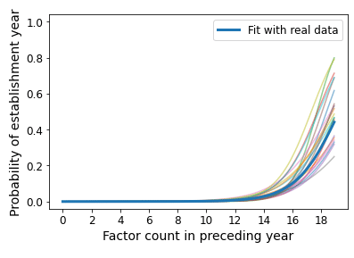 The plot below shows fits from logistic regressions of establishment year against factor count in the preceding year. Each multicoloured, transparent line corresponds to a fit with a randomly selected set of 3 out of the 10 fields dropped from the analysis (the plot contains 20 of these lines). The thick blue line shows the fit with the original data. The plot shows that randomly dropping 3 fields can have a reasonably large effect on the fit, but doesn’t qualitatively change the fit.