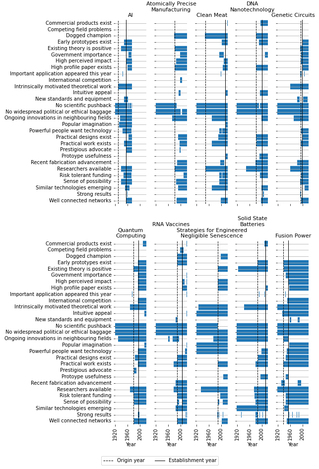 There’s one panel for each of the 10 fields we looked at. Each row corresponds to the status of a particular factor for that field at a particular time (note that for AI the data only runs until 1974). The origin year and the establishment year for each field are shown with dashed and solid vertical black lines, respectively.