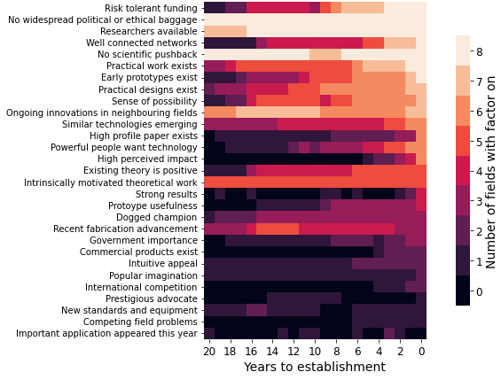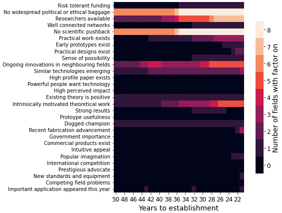 For these 3 factors, finding that they tend to be switched on by the time field establishment happens probably doesn’t provide very useful information by itself. These factors still seem useful, however: for example, it might be interesting to know what the lag tends to be between “risk tolerant funding” switching on and field establishment.