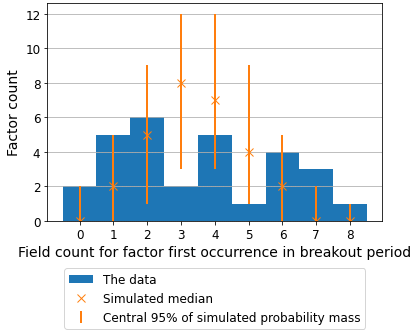 To do this, I started by working out how often on average an arbitrary factor first occurs within the breakout period for an arbitrary field within our data. This turns out to happen roughly 44% of the time (note that I only considered data from the 8 fields we consider to have become self-sustaining, since we only know the endpoint of the breakout period for these fields). I then used simulations to calculate how many of the 29 factors you’d expect to have all 8 first occurrences within the breakout period (and similarly for 7 first occurrences within the breakout period and 1 outside the breakout period, etc), assuming that being inside the breakout period is something that happens with 44% probability irrespective of the identity of the factor or field (or in other words, what you might expect to happen “just by chance”). The results are shown below, alongside our actual data.