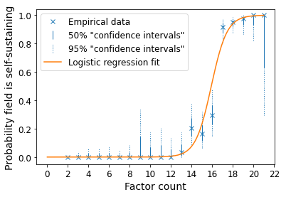 The confidence intervals are calculated assuming independent observations (but the observations aren’t independent) and can’t account for selection effects. This will tend to mean they underestimate the uncertainty. On the other hand, they also don’t incorporate information such as “the probability will tend to increase with increasing factor count” or “the probability will tend not to vary too quickly with respect to factor count”, which will tend to mean they overestimate the uncertainty. So it’s not even clear whether the “true” confidence intervals should be bigger or smaller in any particular case. The confidence intervals are the Clopper-Pearson confidence intervals for binomial proportions computed with a Python package called statsmodels. ↩︎