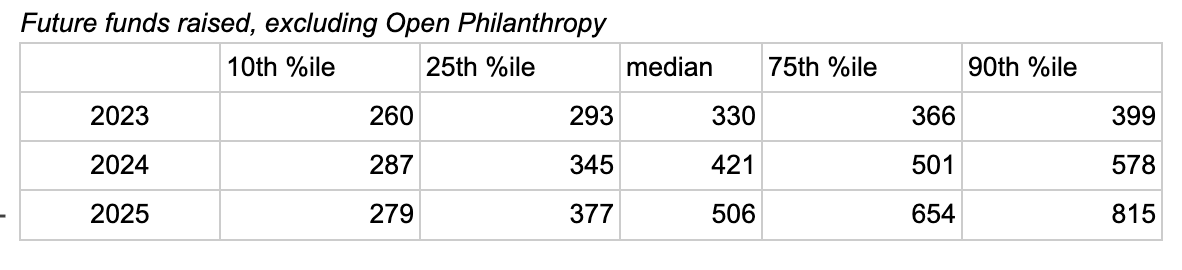 In November 2021, we wrote that we were anticipating rapid growth and aiming to influence $1 billion in 2025. Now, our best guess is that we'll raise between $400 million and $800 million in 2025 (for comparison, we raised around $600 million in 2022). As in the chart above, we now think it's possible but unlikely that we'll raise close to $1 billion in 2025, and we also think it's possible but unlikely that our funds raised in 2025 will be substantially lower (e.g. around $300 million) than they were in 2022.