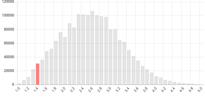 This is a graph which represents the rough distribution (N = 1,982,574; ~57% female) of Dark Core levels in the general population; presumably, anyone who has completed the scale and given consent for it to be used is represented. This graph suggests a bell-curve distribution that is somewhat positively skewed (the 50th percentile is 2.614286, while the scale midpoint is 3). This also suggests that it would be theoretically feasible to identify and exclude exceptionally malevolent individuals from important positions (one might have the cutoff at scores higher than 3.8, for example) without affecting a large subset of the overall population (in this case, ~5% of the population would be affected).