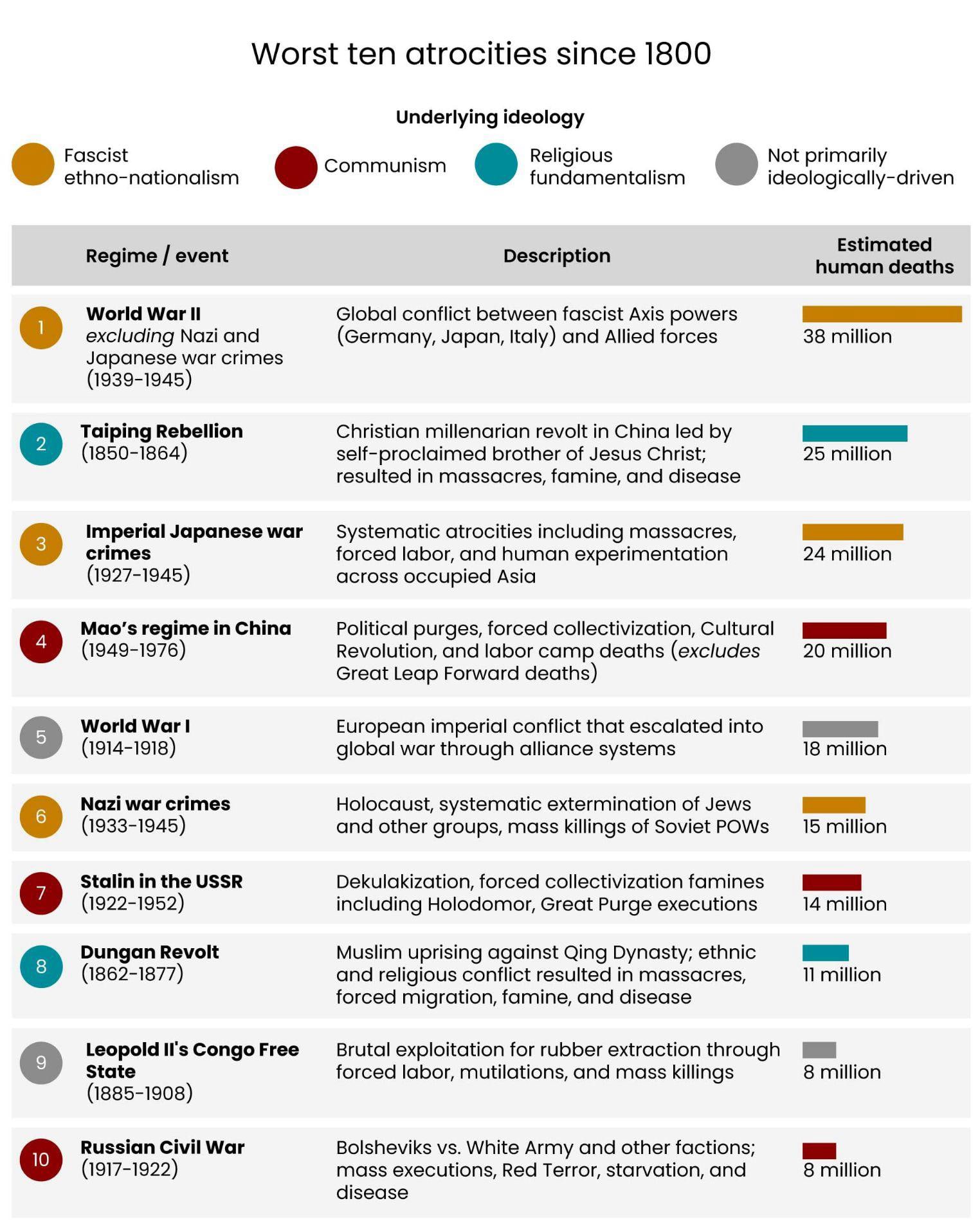 - Such ideological fanaticism was a major driver of eight of the ten greatest atrocities since 1800, including the Taiping Rebellion, World War II, and the regimes of Stalin, Mao, and Hitler.