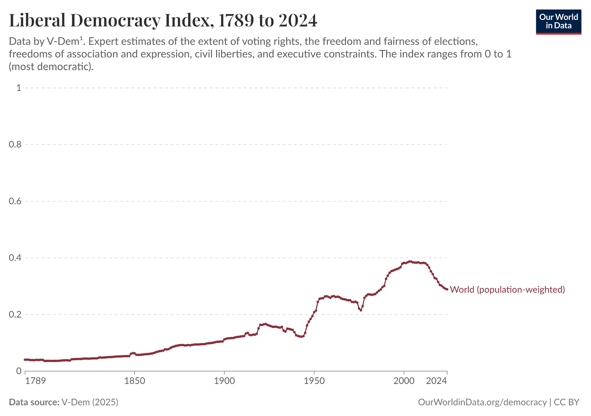 Fortunately, however, World War Two wasn’t the end for liberal, enlightenment values. On the contrary, the post-war period saw democracy's gradual expansion, accelerating after the Soviet Union's collapse. In the post-Cold War era of the 1990s and early 2000s, liberal optimism reached its zenith, encapsulated by Francis Fukuyama’s international best-seller The End of History and The Last Man (1992), which hypothesized that, following the defeat of communism and fascism, civilization might be nearing the end of history due to “the universalization of Western liberal democracy as the final form of human government”.