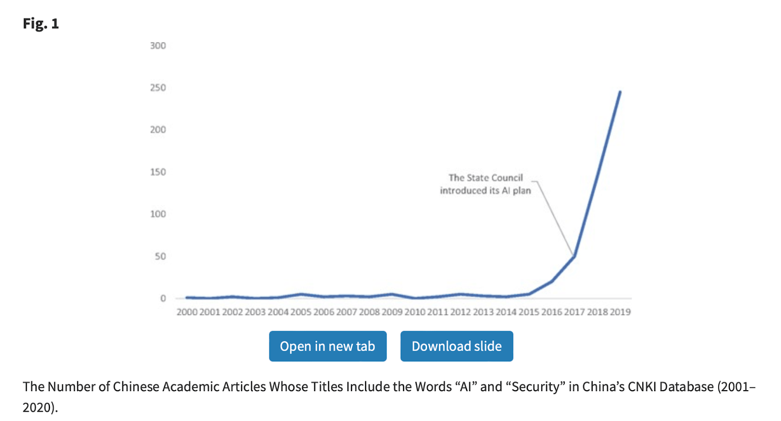 Similarly, national security rhetoric around AI has been particularly prominent since the the State Council of China’s “New Generation Artificial Intelligence Development Plan” in 2018. This document cites “national security” 8 times, "national defense" 11 times, and “security” 48 times (Zheng). This language is also increasing rapidly in Chinese academic articles.