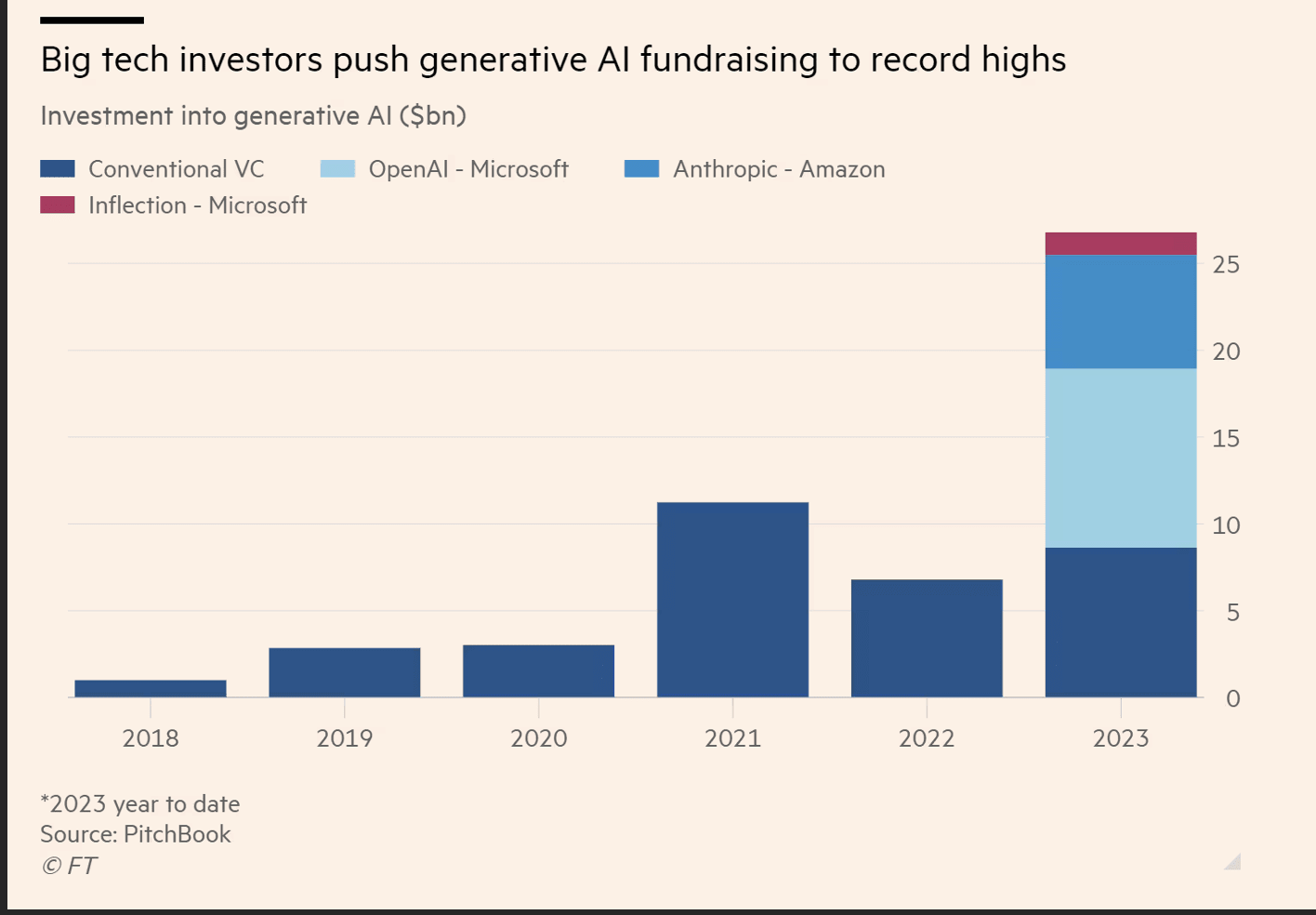 Microsoft’s influence over OpenAI was pretty visible in the recent Sam Altman saga (more on this below). The fraction of investment from Microsoft and Amazon into Generative AI is increasing and now exceeds conventional Venture Capital fundraising. Whilst I speak a little about the Altman saga below, I recommend Merredith Witthaker’s piece for a strong formulation of this claim.