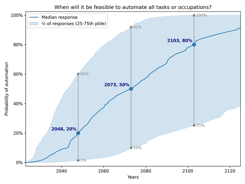 2047 is the median for all tasks being automated, but the median for all occupations being automated was much further away. Both scenarios should be equivalent, so I think it makes sense to combine the predictions for both of them. This results in the median expert having a median date of full automation of 2073.