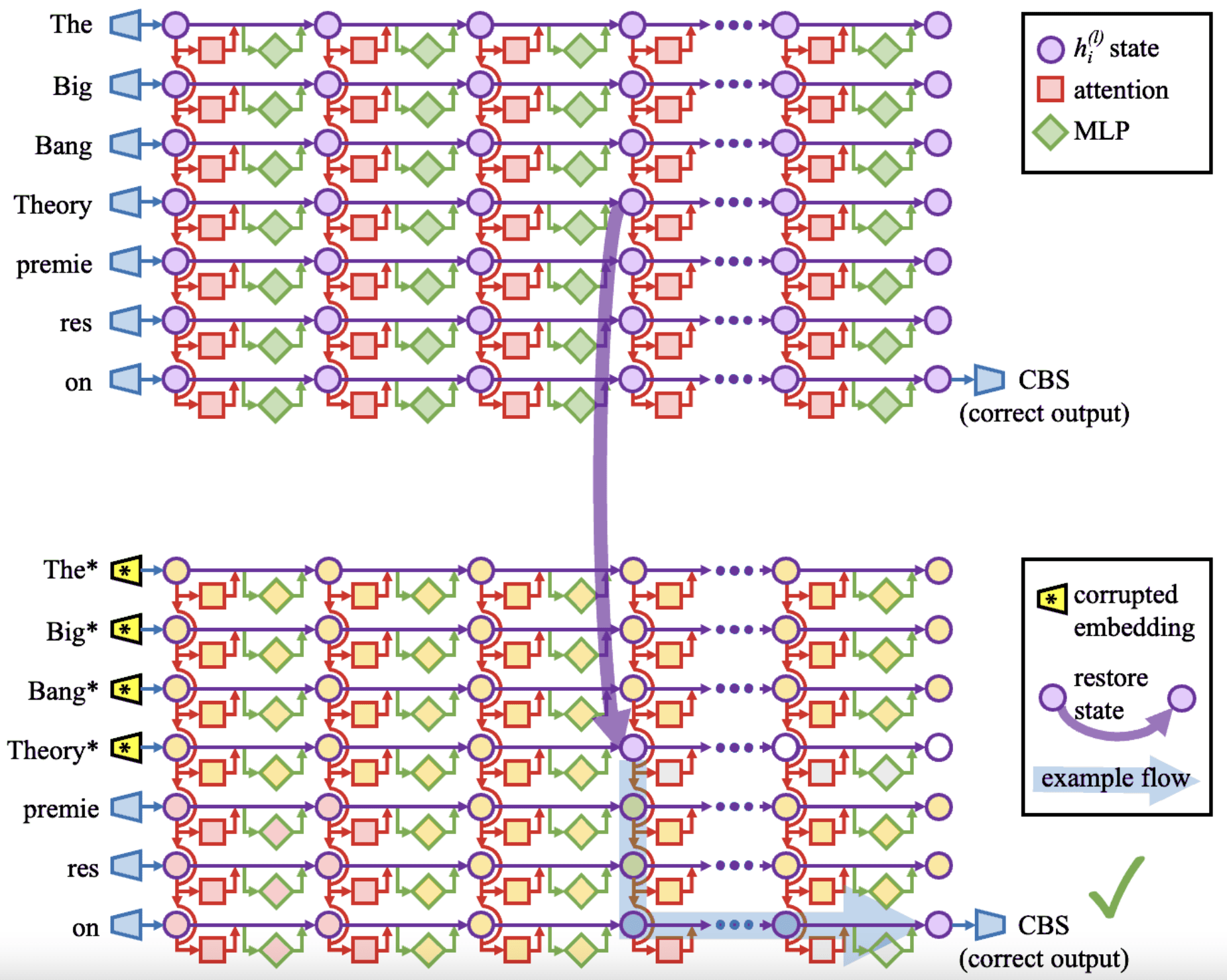 I want to specifically understand how the model recalls the factual knowledge of where the Eiffel Tower is. But the prompt "The Colosseum is in" controls everything, apart from what the landmark is. And so a surgical intervention you can do to understand which chunk of the model represents this knowledge about the Eiffel Tower is to take some layer or the residual stream at some point and patch it into the input. You would give them all the input, "The Colosseum is in." You would take this layer. You take its value on the Eiffel Tower prompt, and you edit the Colosseum run to replace it with the Eiffel Tower value. And you see which layers matter for producing Paris and which ones don't. And because this is such a surgical intervention, it can tell you much more useful things.
