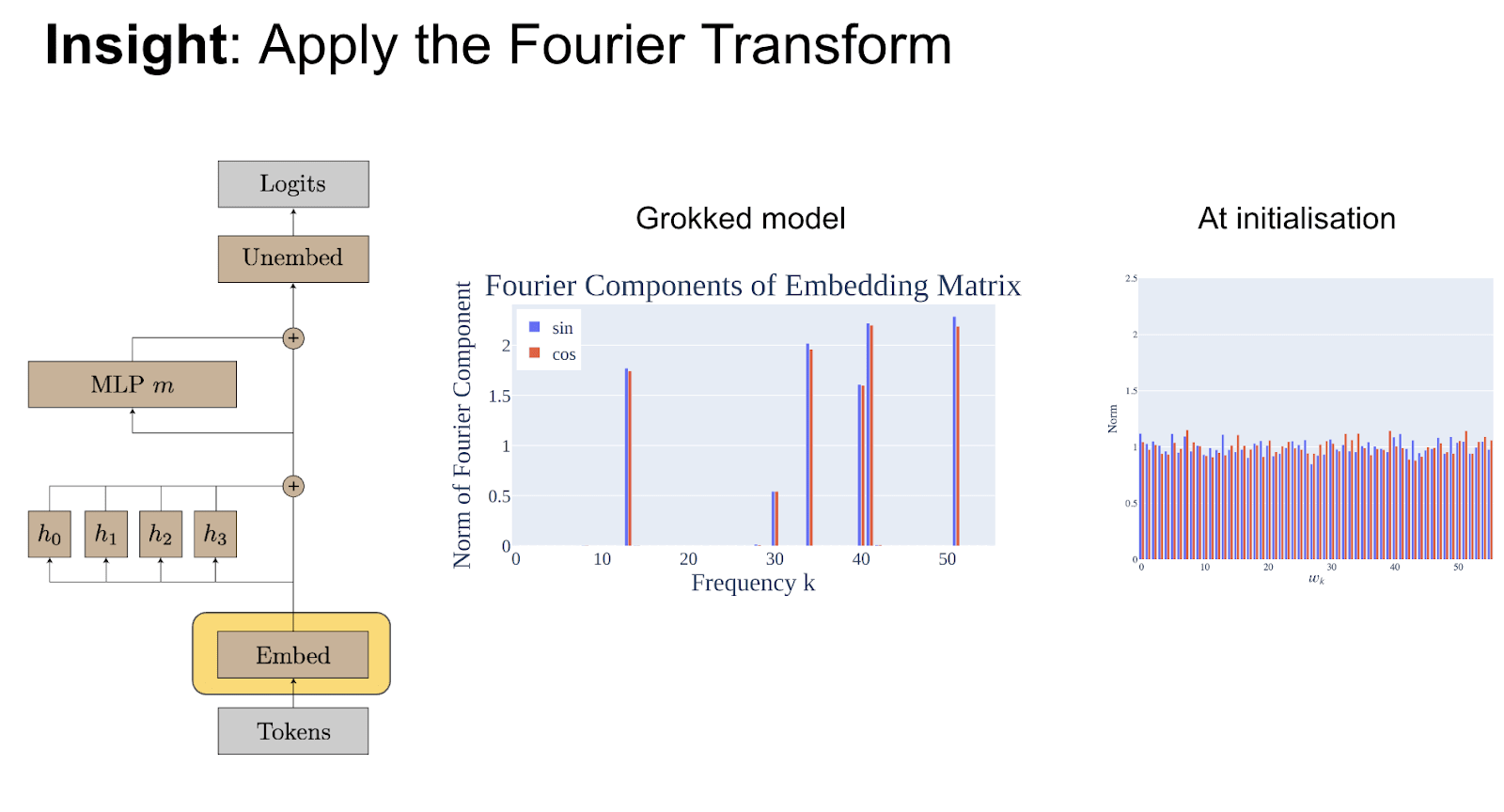 The key insight to getting traction on what was happening with this model is noticing - the input seems kind of weird and circle-y and periodic. What do we do to understand periodic things? We use Fourier transforms. And taking the model and asking, "How does it embed the input in terms of sums of sine and cosine waves at different frequencies?" It turns out that it's just incredibly sparse at this while sine models are just completely random. Something interesting is going on.