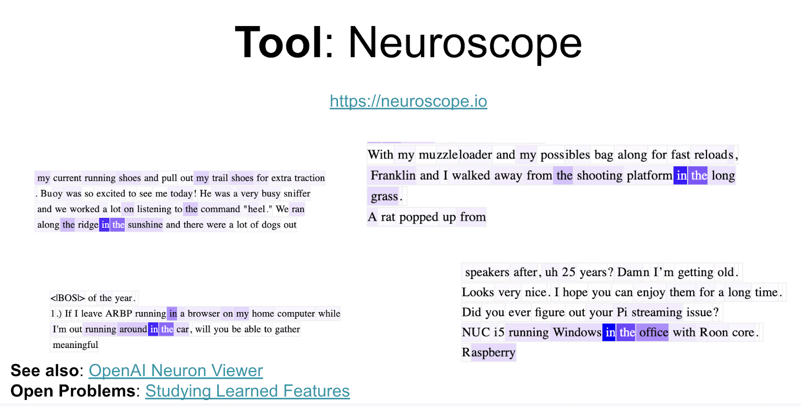 I have this tool called neuroscope where you can just take millions of neurons and a bunch of open-source models and see the text that most activates them. Like, here's a neuron that seems to activate on the text “in the,” and immediately after text about running or walking or motion. Because why not? Unfortunately, OpenAI recently put out a paper, which just has a certainly better version of this. You probably could look at that instead.