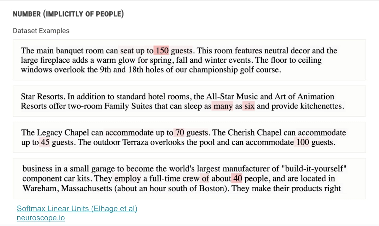 Here's one of my favorite neurons - numbers that implicitly refer to groups of people neuron from their softmax linear units paper. But for the most part, people just haven't looked that hard at just what's out there.