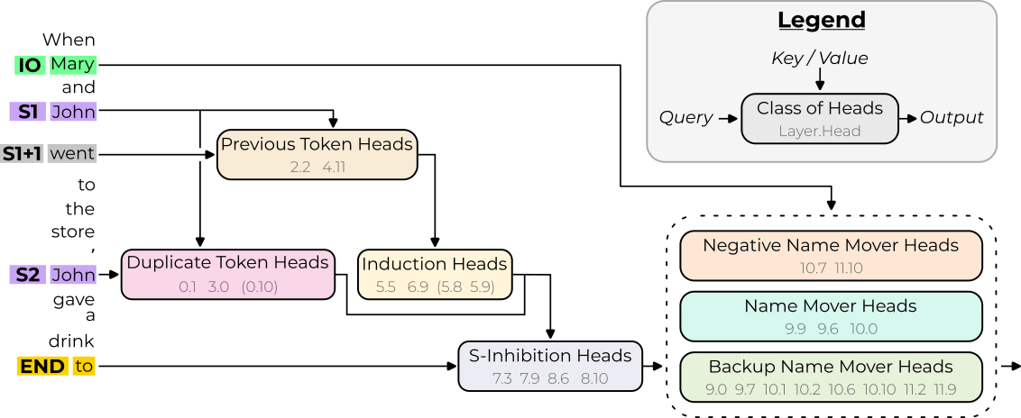 Here's a case study: the “Interpretability in the Wild” paper. They took GPT-small and asked, "How does GPT-small do this grammatical task: When John and Mary went to the store, John gave the bag to." The next thing is Mary rather than John. This is a grammatical task. It comes up a fair bit. It's called indirect object identification, and GPT2-small genuinely cares about answering it. How? They did a bunch of cause interventions and found 25 head circuit. And I think this is a really cool paper. I learned useful things, and I think that you can build on the techniques to just figure out how language models do a bunch of other tasks. In the process finding circuits in the wild, I give a bunch of problems and resources.