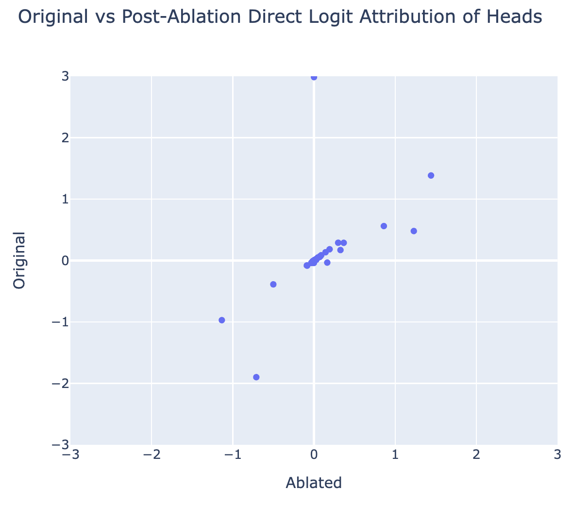 One of my favorite bits of the "Interpretability in the Wild" paper was finding that this isn't actually that reliable. They found this phenomena of backup heads or redundancy. They found that if you take some crucial heads and you delete it, there are heads in subsequent layers that will systematically change their behavior to compensate. A head goes from a bit positive to very positive. A head goes from very negative to a bit negative. This means that the overall effect is likely not that high.