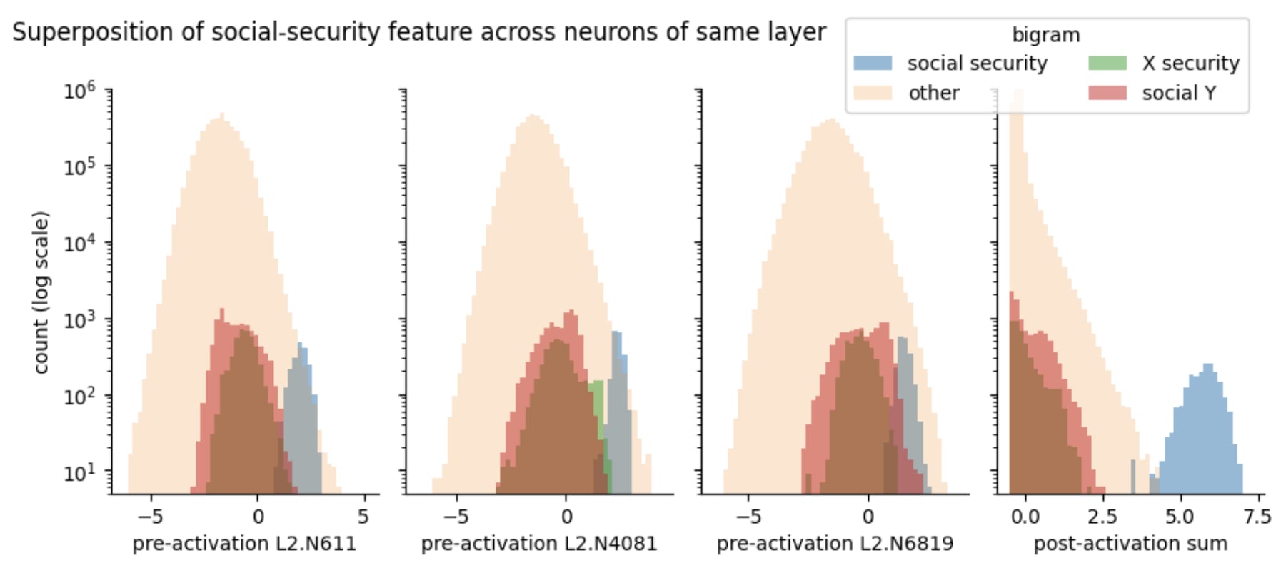 Here's a paper I put out about 3 weeks ago led by Wes Gurnee, one of my math scholars, called "Finding Neurons in a Haystack" where we found, in my opinion, reasonably compelling evidence that models do use superposition a lot in early layers. We looked at how models detected compound words like Social Security. We found a bunch of neurons that were mediocre Social Security security detectors. But if you add together, say, three of them, this only becomes a pretty great Social Security detector.