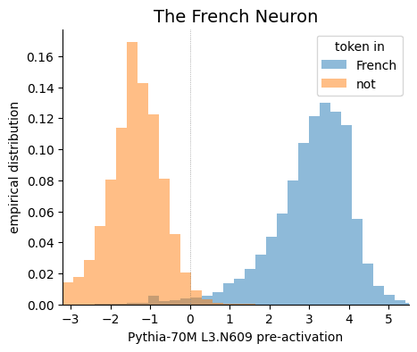 A challenge motivated by this paper is, can we find a neuron that we can actually prove is meaningful? The neuron just corresponds to a single concept. And we found the French neuron, a neuron which seems to represent French. But I don't think we've actually proven that this represents French. There is this great paper called "Curve Circuits," which, to my lights actually does prove that they found some curve-detecting neurons in a language model. But I think there are a bunch of challenges, like look at the model on every kind of data it could ever experience in training, and see if it ever activates on non-French stuff. See if there's rare features. Also, questions like "What even is French?" When should the neuron activate? This is kind of an uncertain, interesting question. And I think that even just the project of trying to solve and make progress on this would be a pretty interesting one.