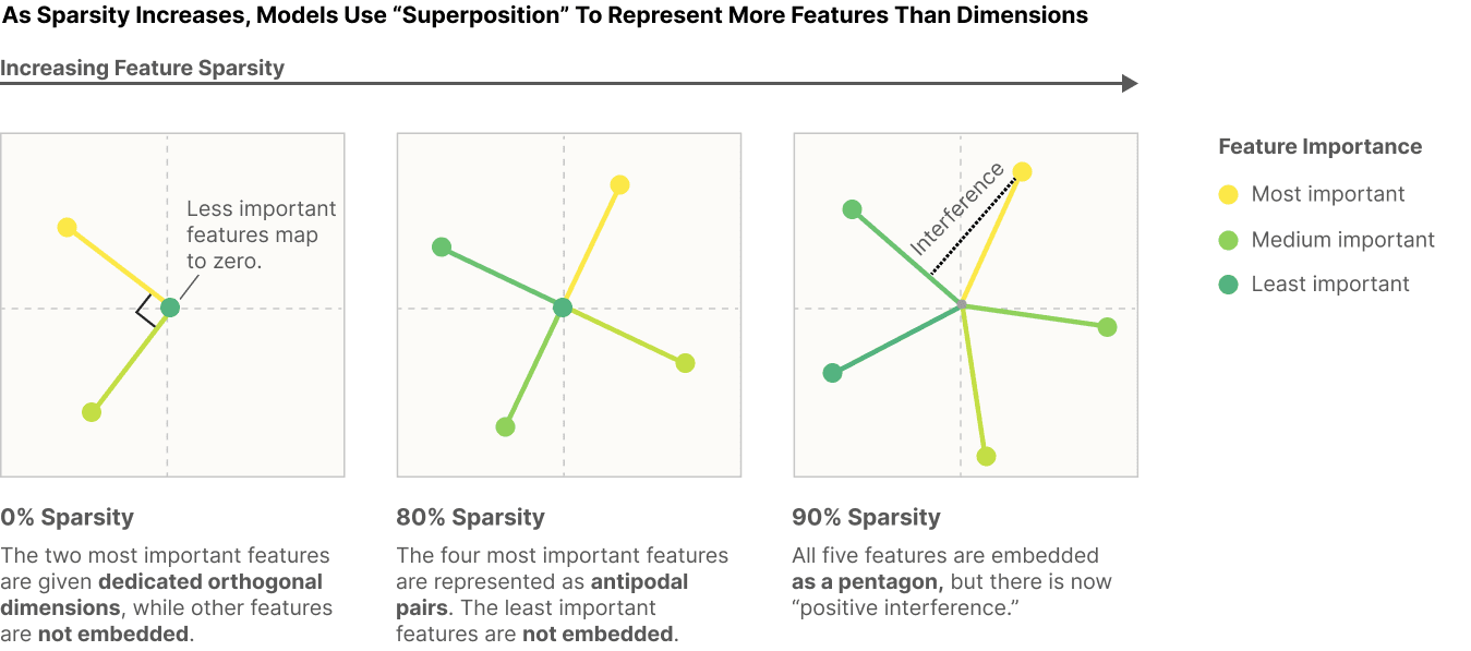 They found a bunch of really interesting results, like they don't actually use superposition. That models were trading off the amount of features they could represent against interference between features. That models could represent features as the features became sparser and less common, models were much more willing to use superposition. And I think this is incredibly cool.
