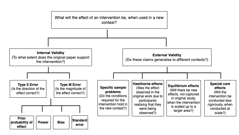 External validity refers to the extent to which an RCT/ quasi-experimental result will generalise, if the same study is undertaken in a different context. Although I view external validity as being probably more critical than internal reliability in determining an intervention’s success, there is a far smaller amount of relevant evidence here. I take the view that we should approach this question mechanistically, by examining (1) the extent to which the conditions required for the intervention to work hold in the new context (note that we should expect some RCTs will have effects going in the opposite direction when tested in a new context); (2) whether the effect in the RCT was larger due to participants realising that they were being watched (social desirability biases); (3) whether there are emergent effects from the intervention that will appear once it is scaled up, and; (4) whether the intervention will be conducted in a different way (i.e. less rigorously) when completed at scale (see; Duflo & Banerjee, 2017). Existing empirical work can ground our estimates. For example, Vivalt’s (2020) work suggests that the median absolute amount by which a predicted effect size differs from the same value given in a different study is approximately 99%. In addition, I have created a library of our current discounts here so that researchers can compare their discounts relative to others.