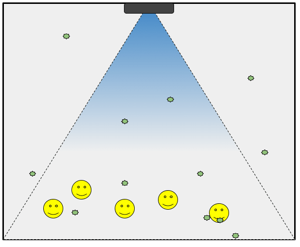 Upper-room GUV, by contrast, does not place humans in direct contact with UV light, and therefore does not require the use of far-UVC spectrum light. As illustrated in the figure below, however, this means that only a fraction of the room is directly irradiated. The human-occupied zone, however, is also the zone where transmission occurs. Therefore, upper-room irradiation alone is not enough; some air movement towards the irradiated zone is required (e.g. by good air flow design, fans, air purifiers, and HVAC — and potentially from the radiant heat of human bodies and other human activity).[41] The complexities of this are discussed in greater detail below.