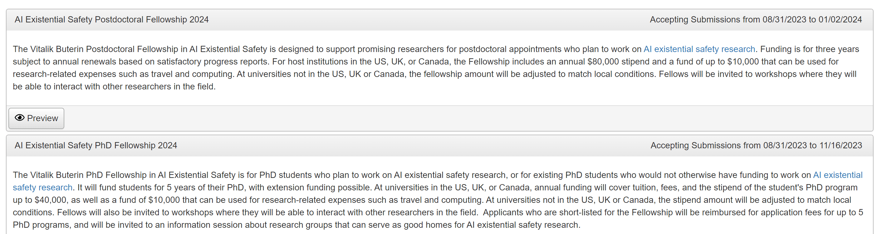 The Future of Life Institute is opening its PhD and postdoc fellowships in AI Existential Safety now. Same as in the previous calls in 2022 and 2023, it has two separate opportunities: