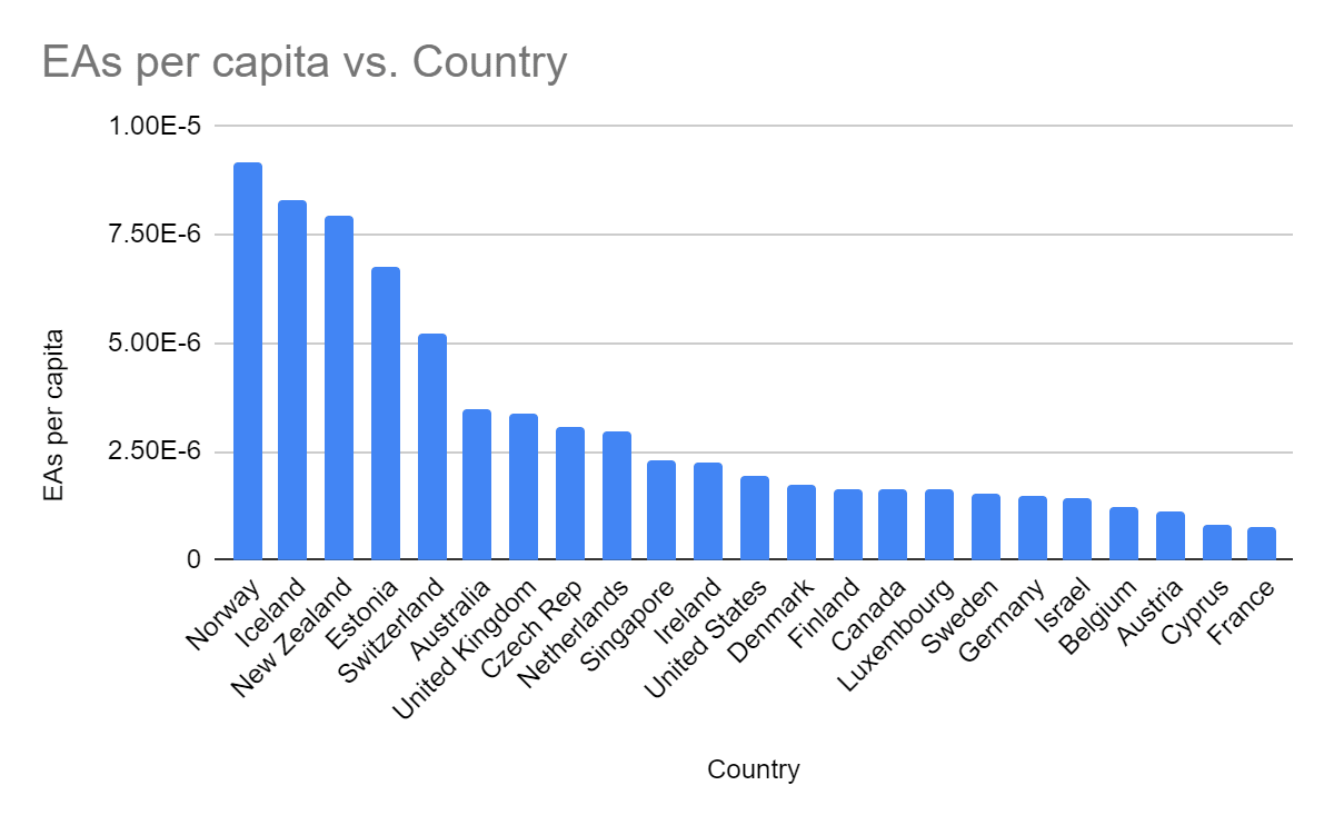 We'll discuss the details more in the post we are putting together on this (hoping to release this month), but there is indeed quite a lot of noise when you look at EAs per capita, and in particular the highest EAs per capita countries, due to small populations and small numbers of respondents, often close to zero (e.g. small countries can jump in and out of the top rankings based on having 5 or 0 respondents in a year). In the full post we'll additionally examine results for composites of years (e.g. 2020-2022), and which countries outperform what a model would predict (though that will be heavily caveated).