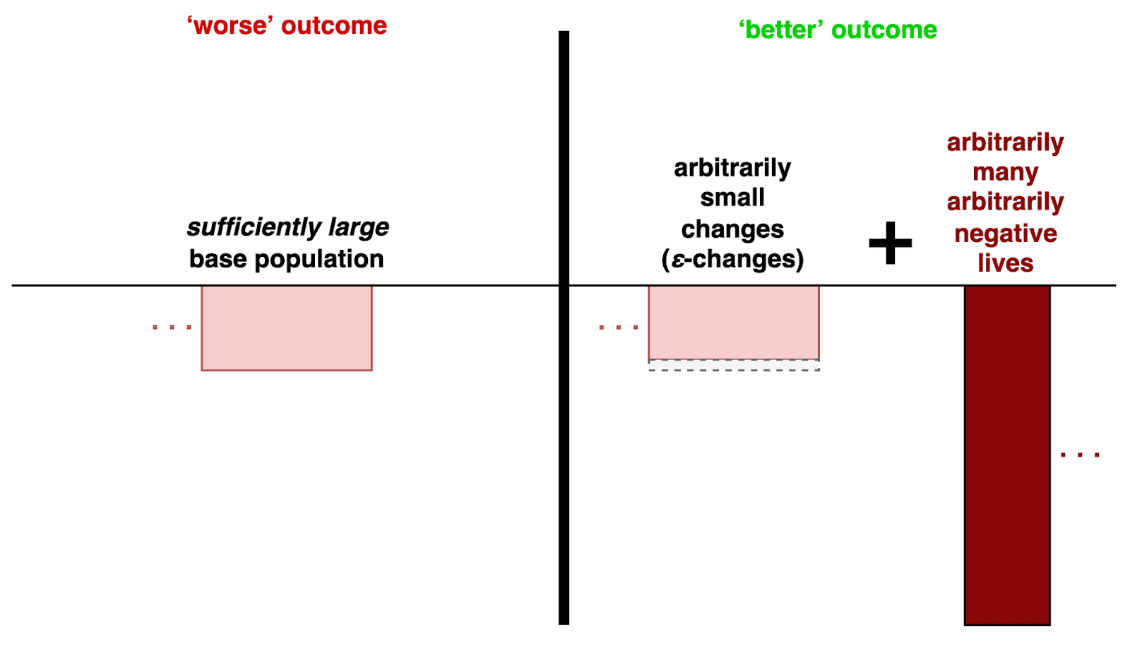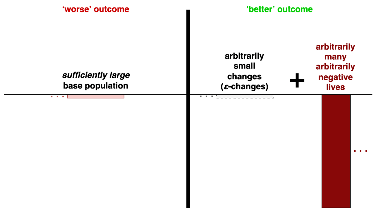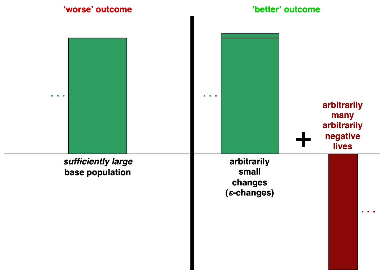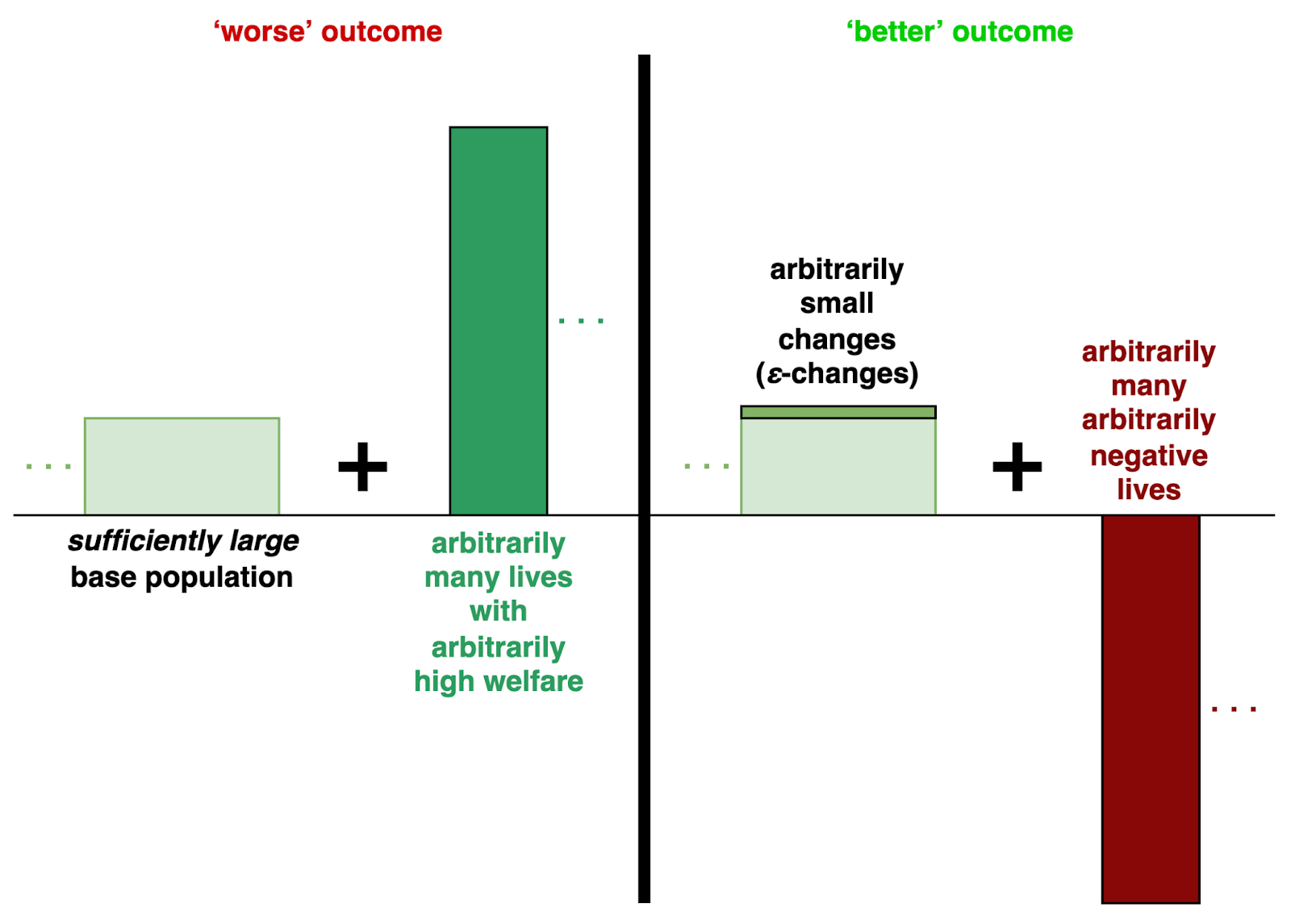 | Rather than adding arbitrarily many lives with arbitrarily high welfare, it is better to add arbitrarily many arbitrarily negative lives and have each life in a sufficiently large base population receive an arbitrarily small quantity (ε) of positive welfare (an ε-change). |